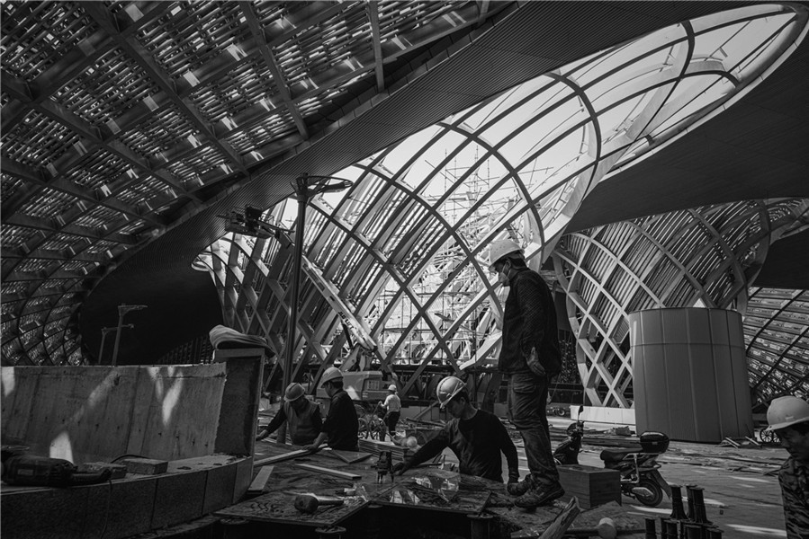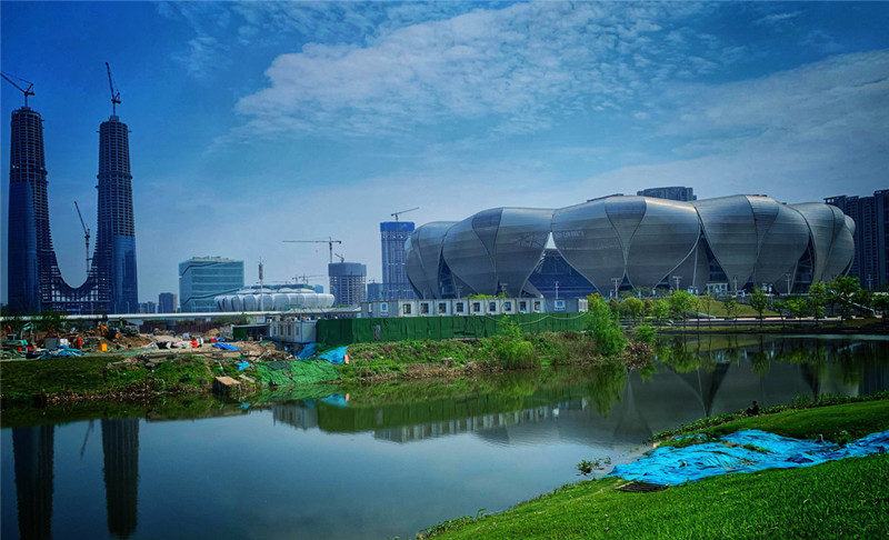 杭州亚运三馆总建筑面积58.15万平方米,作为亚运赛事期间的篮球、游泳、跳水和花样游泳的比赛场馆,是杭州“拥江发展时代”的新地标,它的竣工将带来巨大的时代机遇,推动杭州城市跨越式发展。主体育馆外形宛如“莲花碗”,游泳馆则具有银白色金属屋面和两翼张开的平台式设计,从高空俯瞰,其外形似是张开双翅的“蝴蝶”,设计灵感源自梁山伯与祝英台的中国传统爱情故事。这些无以伦比的建造设计无疑成为采风成员们镜头捕捉的对象,他们纷纷掏出自己的“长枪短炮”,无人机等,寻找最佳的角度、变换最好的焦段,力求设计出最美的构图。用相机记录下这具有中国特色、浙江风采、杭州韵味的美好,留存下最美劳动者的辛劳付出。